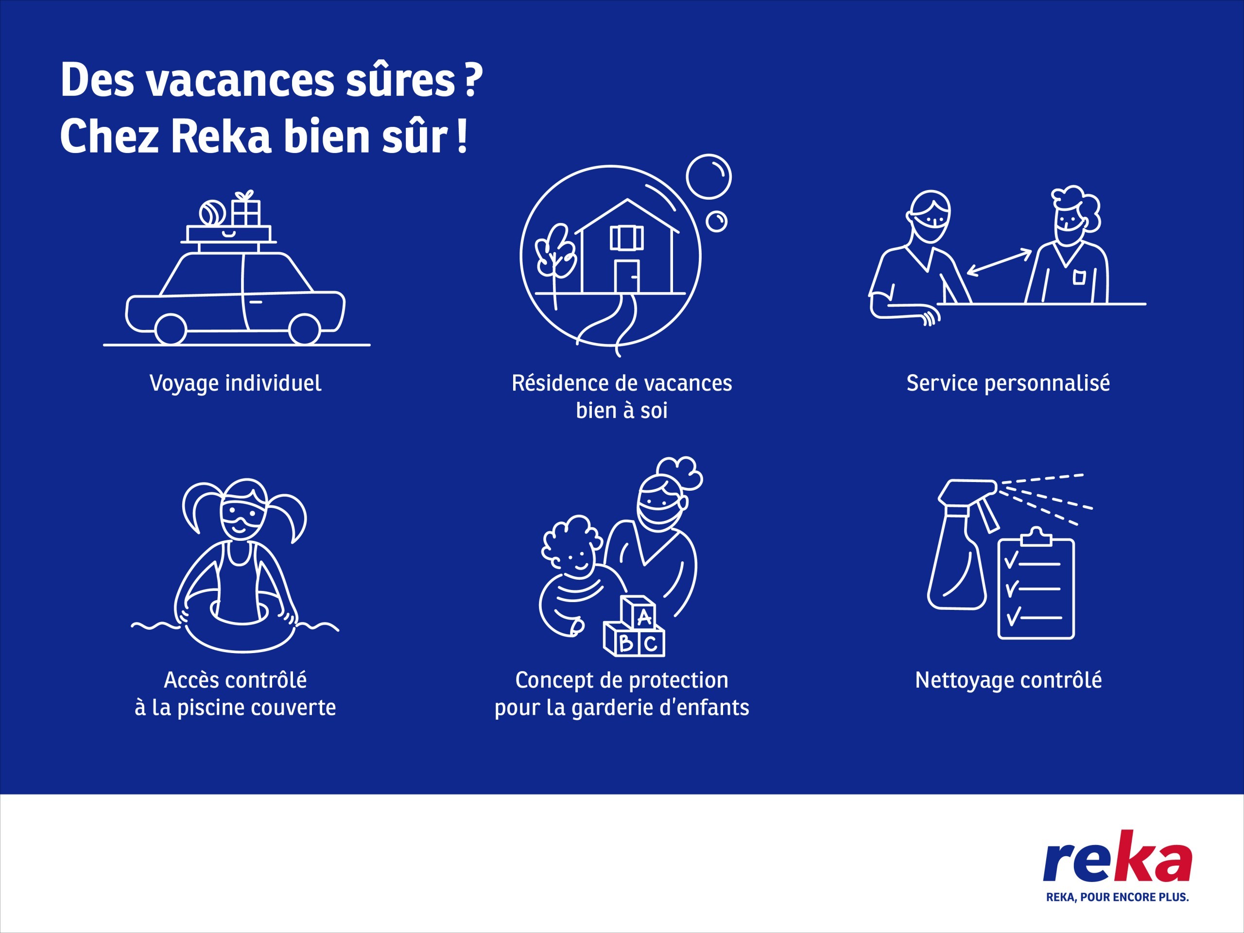 Reka propose deux offres uniques en leur genre : si vous détenez une Reka-Card, vous profitez indirectement d’un rabais à chaque paiement. Car l’avoir de la Reka-Card est obtenu avec un rabais à travers votre employeur ou la Coop. Cela abaisse d’autant le prix des billets de TP, des pleins de carburant, des repas au restaurant ou des activités de loisirs. En passant vos vacances chez Reka, vous profitez de résidences de vacances modernes et favorables aux familles, en Suisse et dans des pays proches. Des prestations de haut niveau à des prix équitables, pour les jeunes et les moins jeunes.